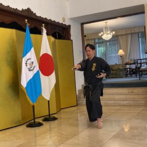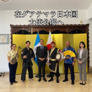 昼食には日本食をご用意いただき、グアテマラの地で日本の味を味わえる幸せに感謝いたします。とても美味しかったです。活動報告の後には、琉球古武道「北谷屋良の釵」を特別演武させて頂き、与那覇さんによる三線・琉球舞踊・エイサーも披露。大使に喜んでいただけたことを大変嬉しく思います。